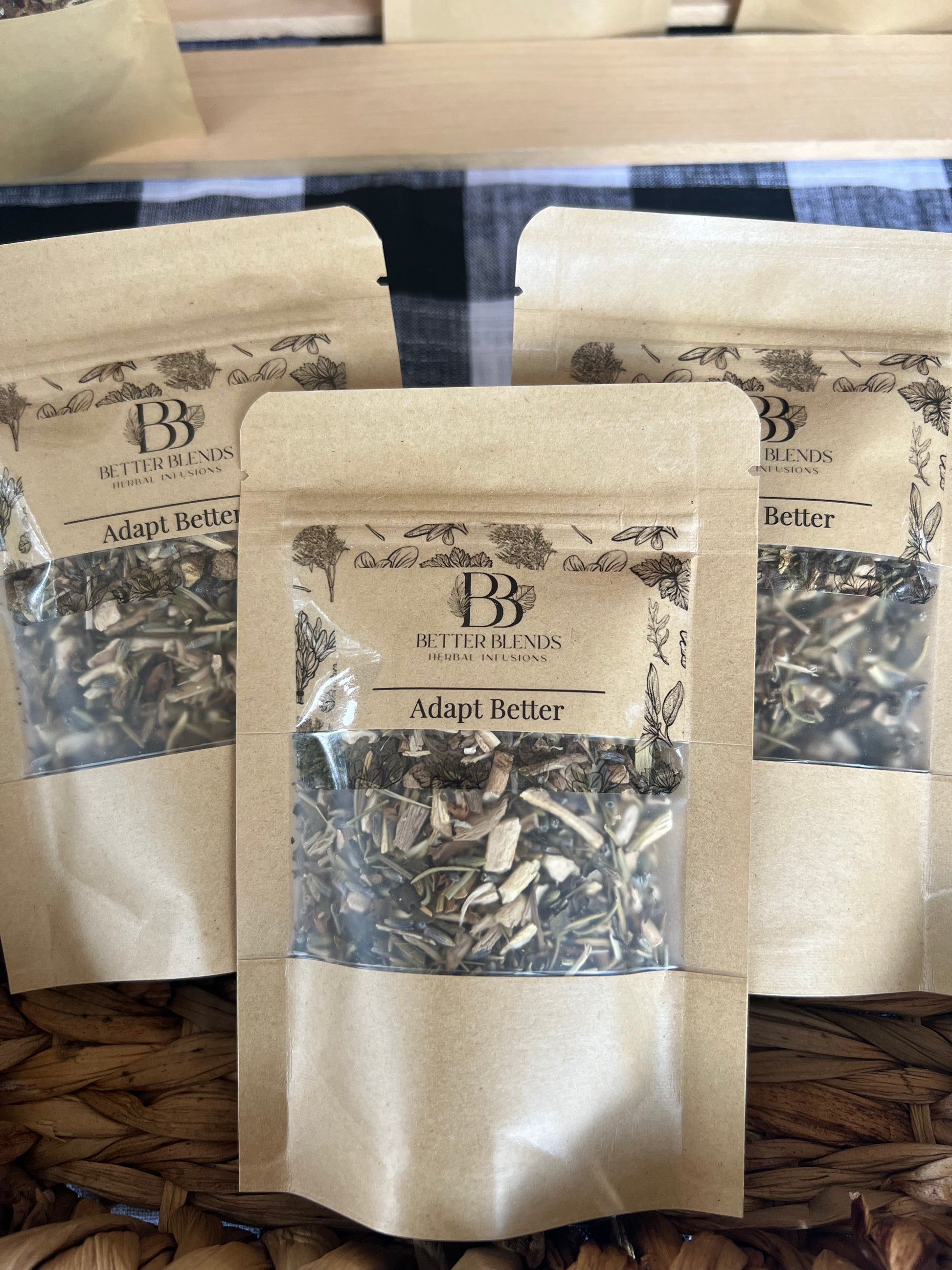 Experience balanced mental clarity and stress relief with our Adapt Better Herbal Tea Blend. This expertly formulated blend combines the power of Tulsi (Holy Basil), Eleuthero, Ginkgo Biloba, Rosemary, Lavender, and Ashwagandha. Designed to enhance focus and cognitive function while easing stress, Adapt Better is your go-to tea for a calm, clear mind.